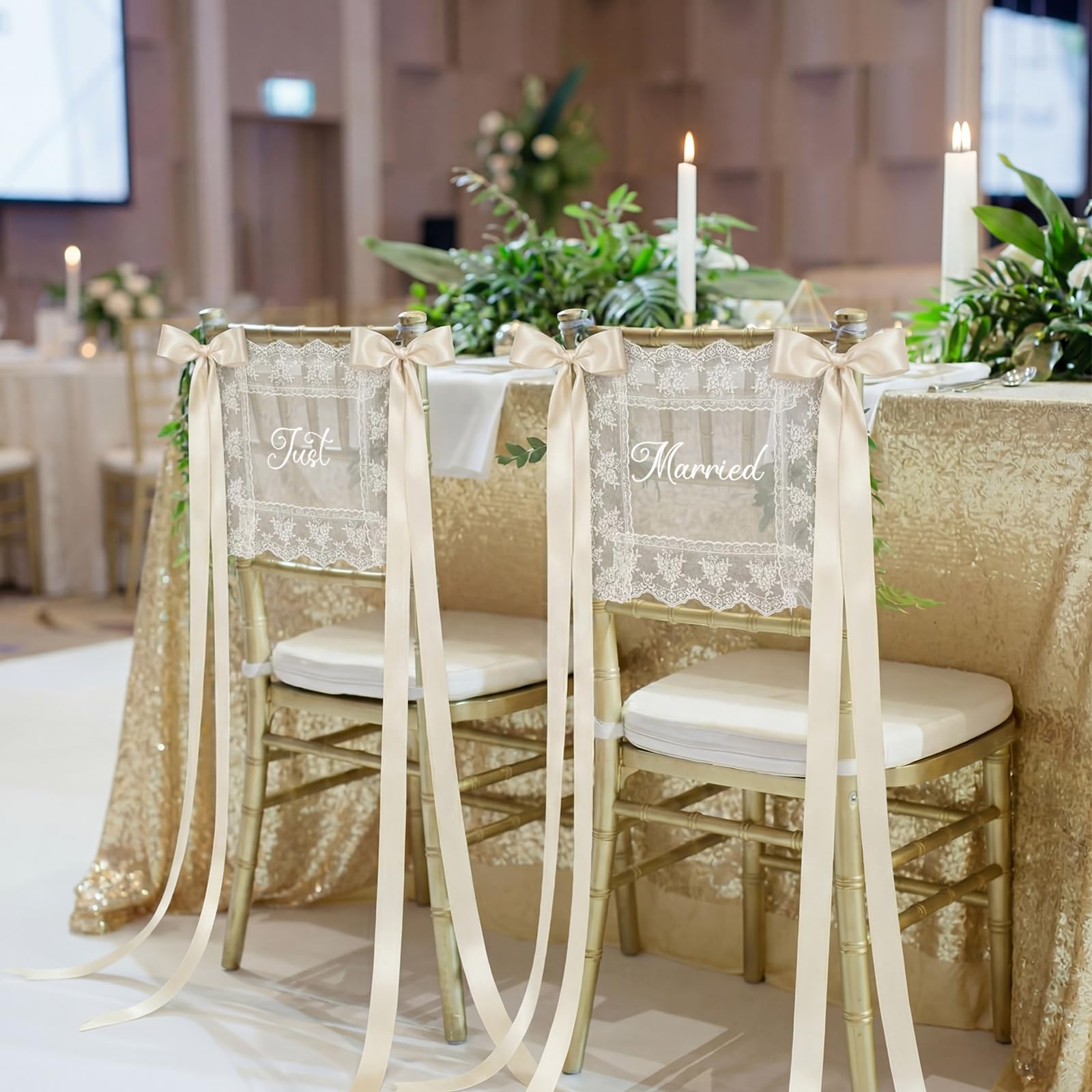 - Wedding Chair Banners: this Just Married sign is designed for the couple's ceremony chairs, sweetheart table, or reception seating, which help guests instantly recognize the couple's seating; And this chair sign is perfect for outdoor garden weddings, church ceremonies, backyard weddings, restaurant receptions, and elopements; These lace chair banners add warmth and romance