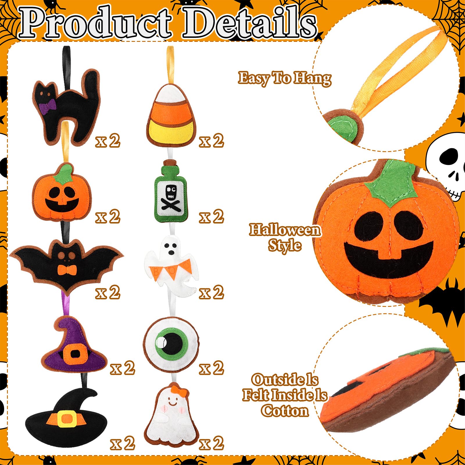 - Bulk Festive Bliss: get more enjoyment with the set of 20 Halloween felt decorations; Featuring 10 unique designs with 2 ornaments each, you have ample options to creatively adorn any space; These fun, festive felt decorations come in a variety of shapes and styles, offering endless decorating possibilities