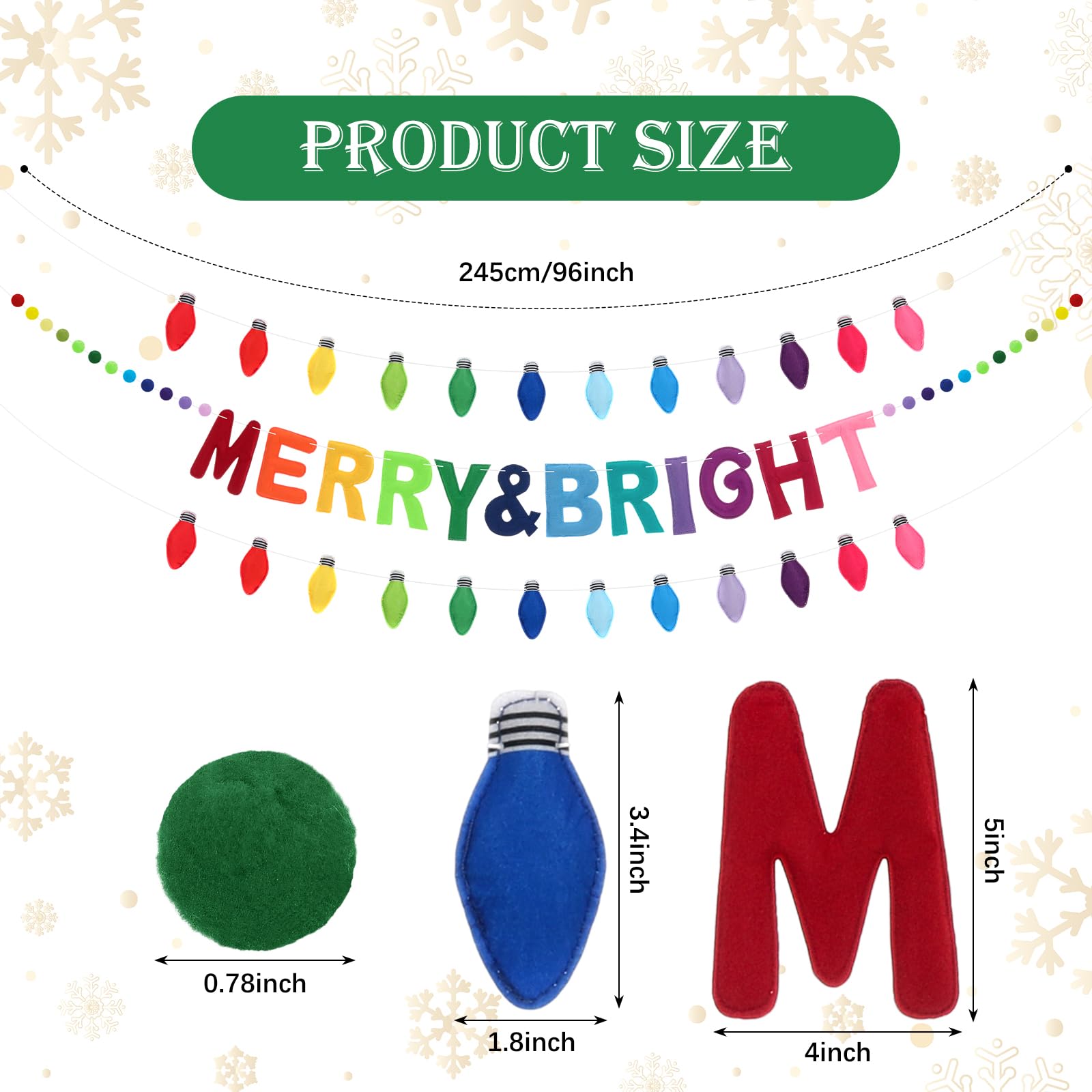 - Complete Festive Set: this pack includes 1 pre-strung "MERRY BRIGHT" felt ball banner (98in long) and 2 rainbow light bulb felt garlands (76in each); The 5x4in felt flags and 3.4x1.76in bulbs fit most spaces, suitable for trees, walls, or mantels