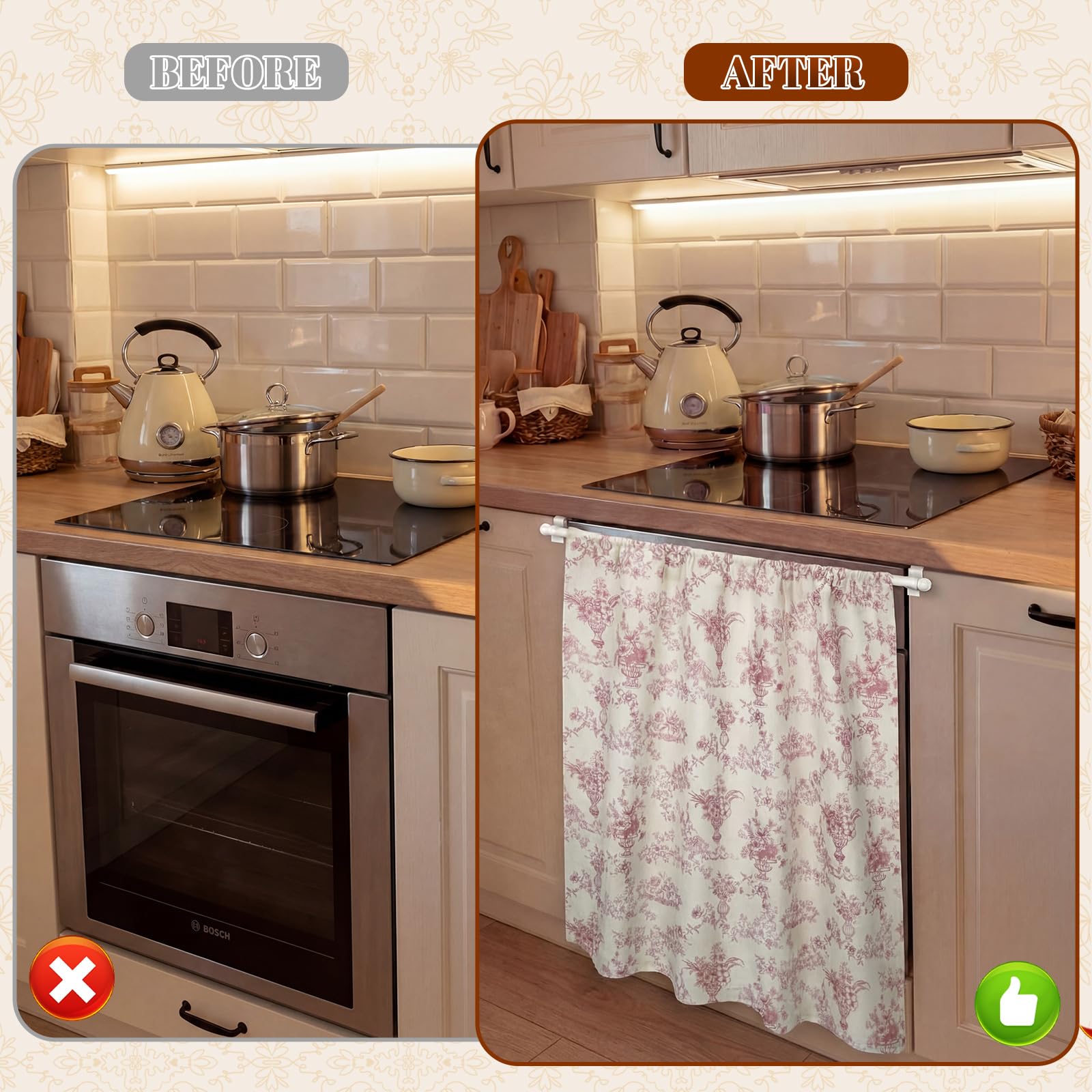- French Floral Pattern: this dishwasher curtain featuring classic french floral patterns with delicate and elegant lines, this design exudes a romantic and vintage charm, injecting a refined atmosphere into the kitchen; Whether it's a modern minimalist or classic and cozy home style, it perfectly complements the space, transforming the ordinary appliance area into a beautiful kitchen landscape